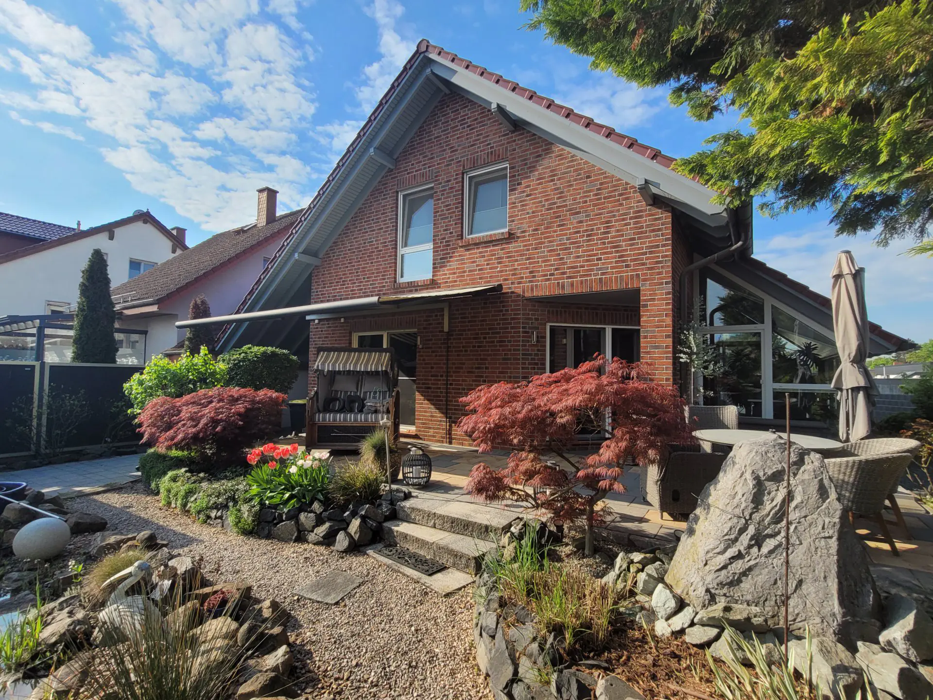 Große Fenster und Türen mit hervorragendem Schallschutz schaffen eine ruhige, warme und freundliche Atmosphäre und bieten einen herrlichen Blick in den mit viel Liebe angelegten Garten.