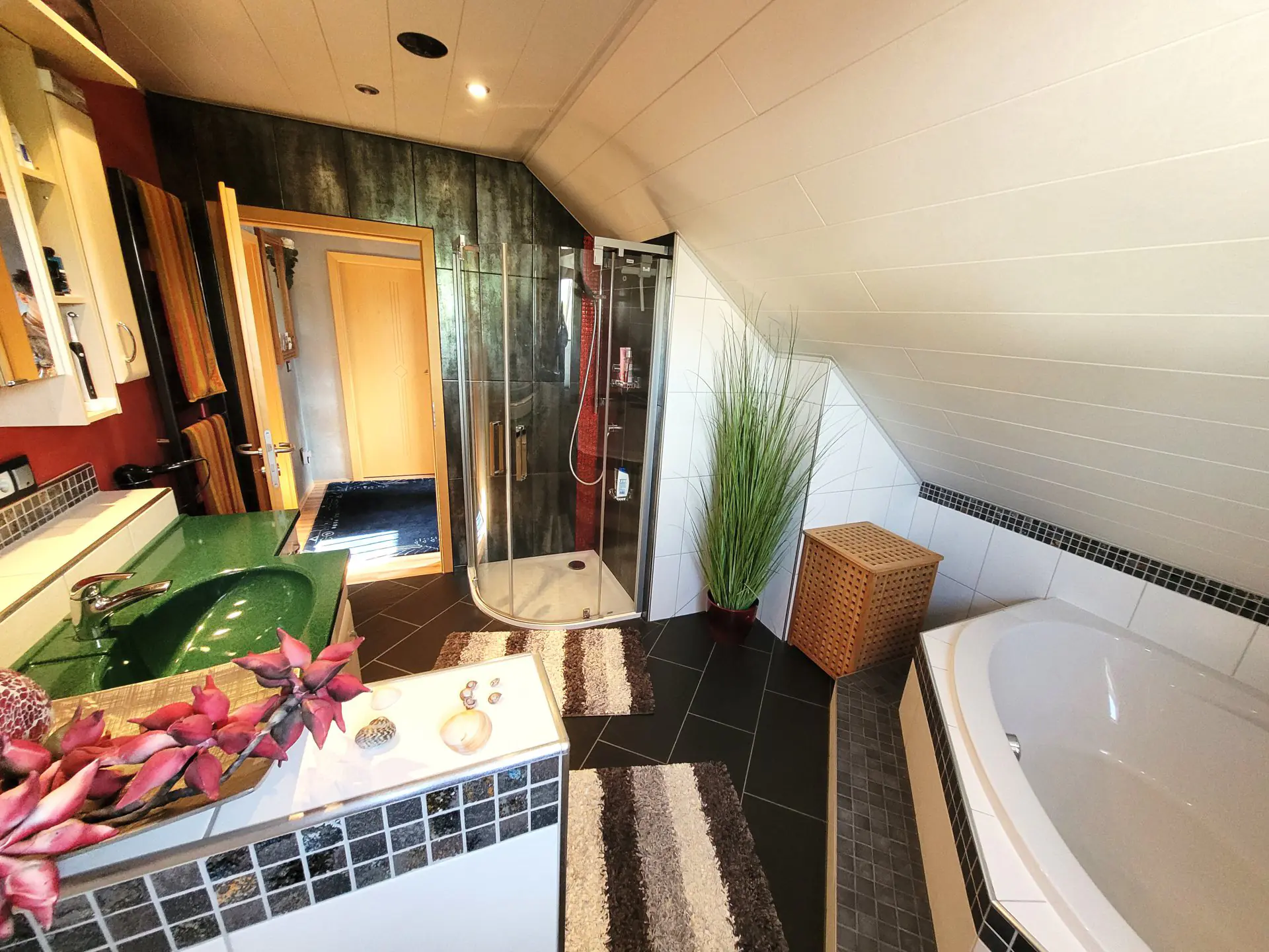 Gäste können im Erdgeschoss das Bad mit Dusche nutzen und wenn Sie in dem großzügigen Gäste- / Arbeitszimmer im Dachgeschoss übernachten, können Sie dort im Bad die stylische Badewanne oder Dusche nutzen. Kalte Füße? Dank Fußbodenheizung hier kein Problem.