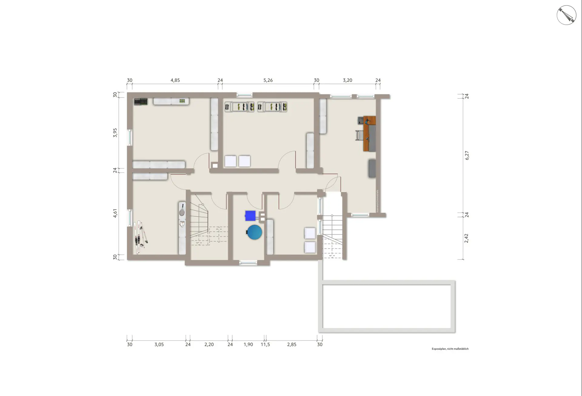 Die Räumlichkeiten befinden sich alle auf der Erdgeschossebene und bieten mit insgesamt drei Zimmern ausreichend Platz zur individuellen Gestaltung. Die großzügige Terrasse mit einer Fläche von ca. 21 m² lädt zum Entspannen und Verweilen im Freien ein. Zudem verfügt das Haus über einen Keller mit einer Fläche von 98 m², der zusätzlichen Stauraum bietet.